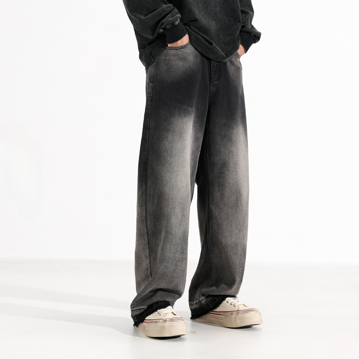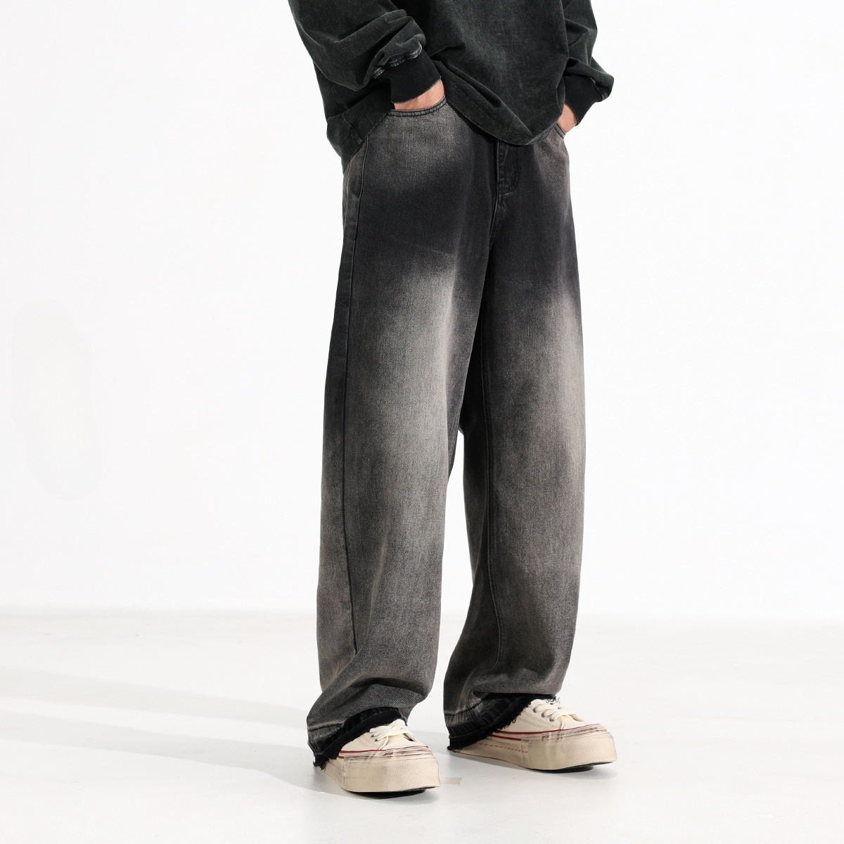 American-style Heavy Washed Black And Gray Straight Jeans Men’s Loose Wide Leg Casual Trousers